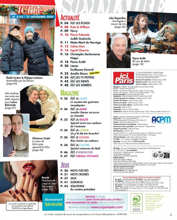 Le magazine Ici Paris vous fait partager la vie publique et privée de celles et ceux qui font l'actualité : exclusivités, interviews, enquêtes (la face cachée du showbiz, les coulisses de la télé) indiscrétions, potins.