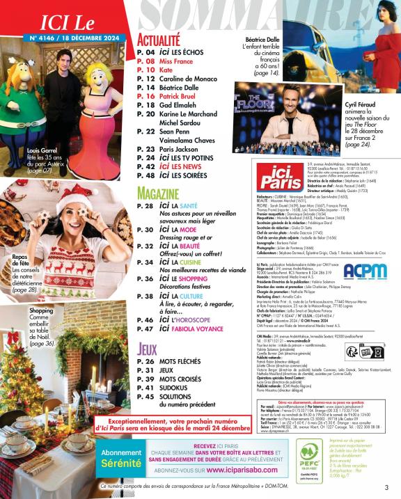 Le magazine Ici Paris vous fait partager la vie publique et privée de celles et ceux qui font l'actualité : exclusivités, interviews, enquêtes (la face cachée du showbiz, les coulisses de la télé) indiscrétions, potins.