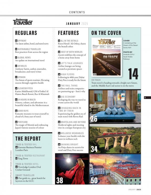 Business Traveller Middle East is the leading magazine for the corporate traveller. We aim to save you money and make your travelling life easier. Each edition has the latest news covering airlines, airports, hotels and car hire companies, regional and international destination features and updates on gadgets, technology and accessories.