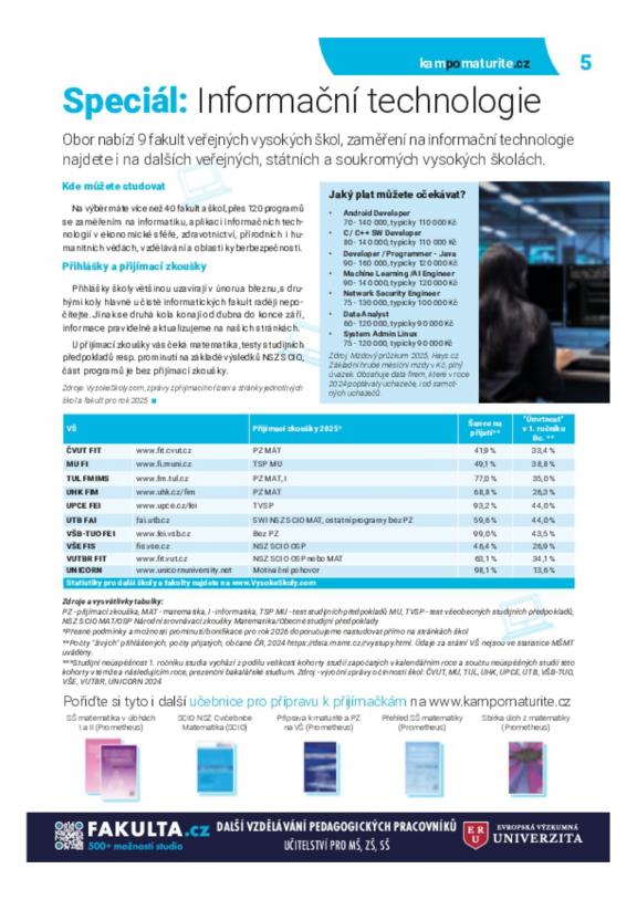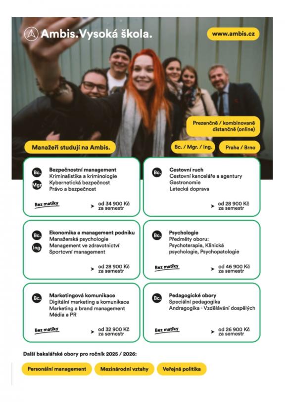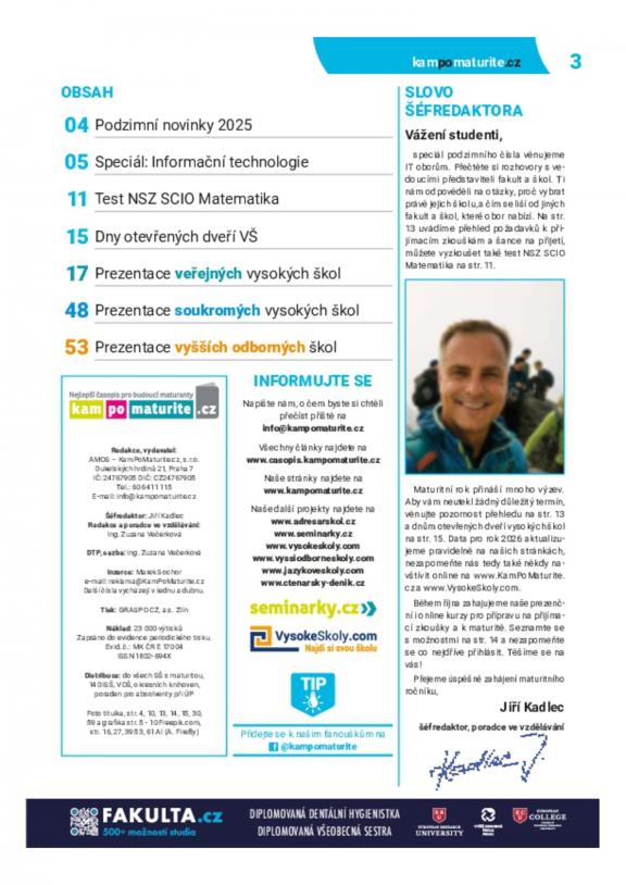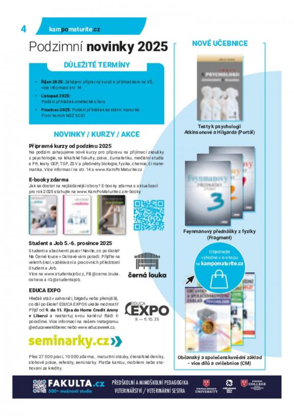 Pořádáme přípravné kurzy, pomaturitní studium a nulté ročníky na přijímací zkoušky VŠ právnických, ekonomických, filozofických a lékařských fakult. Poskytujeme zdarma poradenství, prodáváme učebnice k maturitě, přijímačkám VŠ, SŠ, jazykové učebnice. Vydáváme časopis Kam po maturitě.