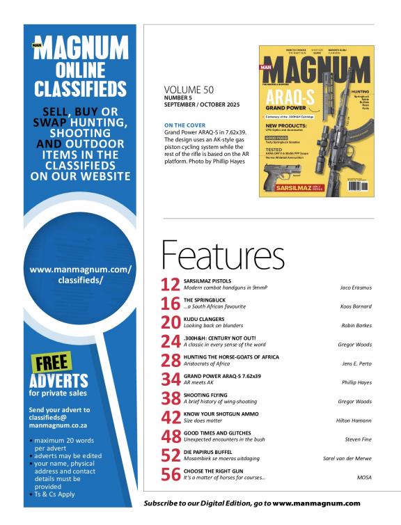 Magnum has a longstanding, worldwide reputation for its authoritative, informative and entertaining features on rifles, shotguns, handguns, black powder firearms, hunting, wing-shooting, hand-loading, African wildlife, history and adventure. Staffed by experts who “tell it as it is”. For the hunter and shooter, Magnum has it all.
