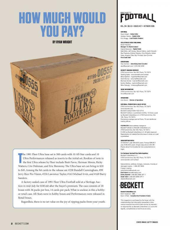 Dive into the exciting world of football collectibles and memorabilia with Beckett Football Magazine. We're thrilled to introduce you to this publication, your go-to source for all things related to football cards, collectibles, and the vibrant hobby of football memorabilia. Beckett Football Magazine, published by Beckett Collectibles LLC, is not just a magazine; it's your comprehensive guide to the world of football collectibles. As you explore the pages of Beckett Football Magazine, you'll find a world of content that caters to football collectors and fans alike: * Price Guides: Access up-to-date price guides for football cards, helping you stay informed about the value of your collectibles.