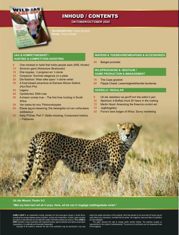 WILD & JAG/ GAME & HUNT is an independent monthly publication for the broad game industry in South Africa, promoting the synergy between game production, hunting and conservation. Hunters, game ranchers and nature conservationists are served with quality informative articles and columns. GAME & HUNT is a magazine that promotes a lifestyle to the kind of reader who does not remain just a reader but becomes a follower of the GAME & HUNT brand. While WILD & JAG/ GAME & HUNT operates in close cooperation with organised hunters, game production and nature-conservation organisations, it is editorially and financially independent. In every edition is to be found a lead article on an important aspect of the wildlife industry as well as an article on a specific animal - including small game, big game and carnivores. Also a nature article (scientific cum popular) on South Africa's plant life and/or geographical features.