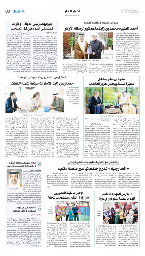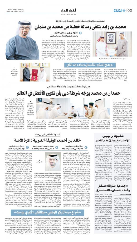 Al Khaleej (Arabic: الخليج, lit. 'The Gulf') is a daily Arabic-language broadsheet newspaper published in Sharjah, United Arab Emirates by Dar Al Khaleej. This newspaper is the first newspaper published in the country.