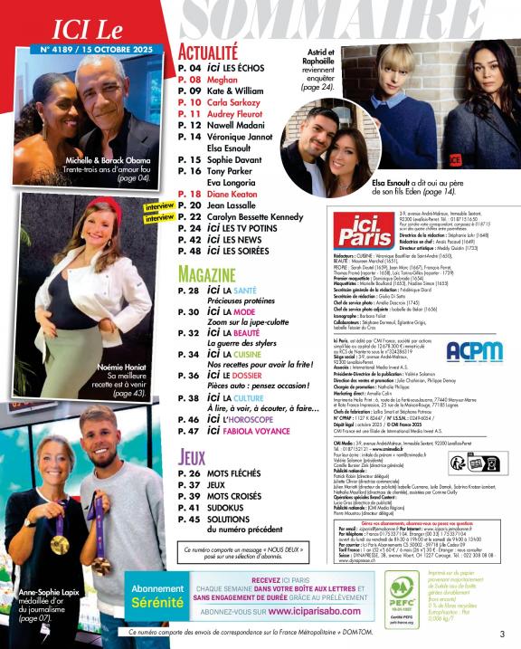 Le magazine Ici Paris France vous fait partager la vie publique et privée de celles et ceux qui font l'actualité : exclusivités, interviews, enquêtes (la face cachée du showbiz, les coulisses de la télé) indiscrétions, potins.