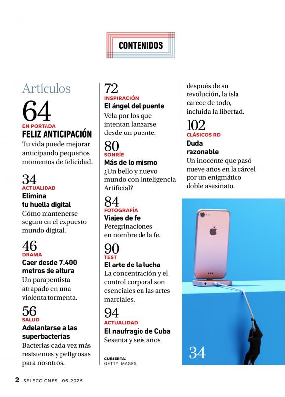 Descubre por qué Reader’s Digest es la revista más leída del mundo. Selecciones es la edición en España de esta mítica revista, editada en nuestro país desde los años cincuenta, con la que tantas personas se han inspirado, informado y entretenido con su amplia variedad de historias sobre gente, salud, humor, aventura, viajes y acontecimientos alrededor del mundo. Reportajes escritos por los mejores periodistas y verificados hasta los más mínimos detalles para garantizar a sus lectores la mejor y más completa información.
