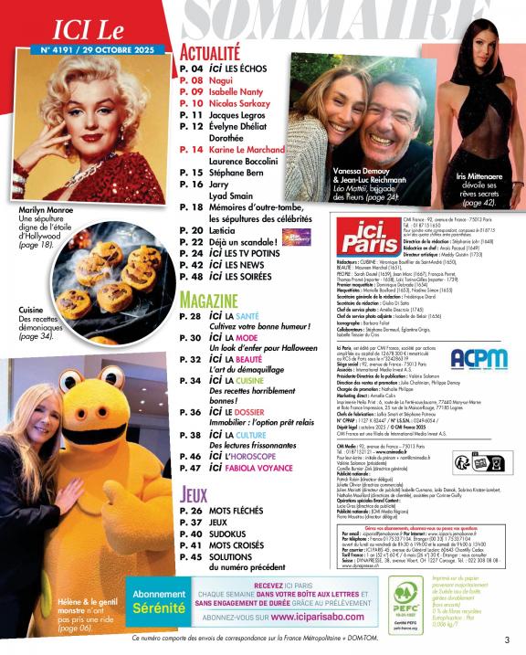 Le magazine Ici Paris vous fait partager la vie publique et privée de celles et ceux qui font l'actualité : exclusivités, interviews, enquêtes (la face cachée du showbiz, les coulisses de la télé) indiscrétions, potins.