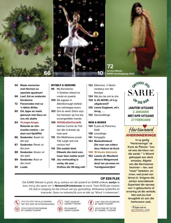 SARIE is die voorkeur-glanstydskrif van die Afrikaanssprekende vrou van Suid-Afrika met ‘n moderne wêreldbeskouiing. SARIE is ‘n intieme deel van haar lewe en ‘n ware voortsetting van haar leefstyl. Maand ná maand vertel die tydskrif tipies Suid-Afrikaanse stories wat haar altyd goed laat voel oor haarself en haar wêreld. Dis na SARIE dat sy haar wend vir kernoplossings en vertroude geselsies. Dis waar sy haar spesiale inspirasie vind.