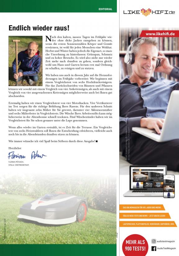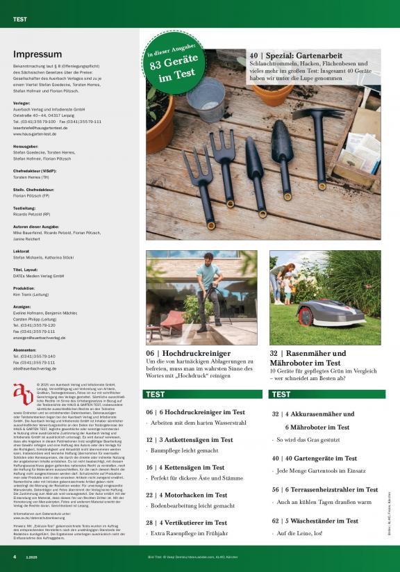 Wir haben für Sie die Geräte rund um Ihren Garten verglichen und für Sie in der Praxis im harten Alltag in Ihrer GARTENWELT getestet: Vier Hochdruckreiniger, vier Allessauger und sieben Nass-/Trocken-Kesselsauger sorgen für ein gelungenes Schmutzgefecht rund um Ihr Haus. Insgesamt 13 Rasenmäher und sieben Rasenmähroboter stehen ebenfalls zur Wahl, um den Schnitt der Grünfläche zu erledigen. Für die Rasenkanten und Ecken haben wir zehn Rasentrimmer genauer unter die Lupe genommen. Zusammen genommen zehn Laubsauger wurden zudem getestet, um auch die Reste vom letzten Herbst noch schnell beseitigen zu können. Sechs Kettensägen und in der Summe ganze elf elektrische Heckenscheren werden verglichen, um auch dem Wildwuchs im Garten professionell entgegentreten zu können. Für die gemütliche und genüssliche Zeit in Ihrem Garten haben wir schon jetzt vier Gasgrills, vier Elektrogrills und ein gemütliches Gartenhaus für Sie auf Lager.