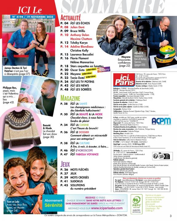 Le magazine Ici Paris vous fait partager la vie publique et privée de celles et ceux qui font l'actualité : exclusivités, interviews, enquêtes (la face cachée du showbiz, les coulisses de la télé) indiscrétions, potins.