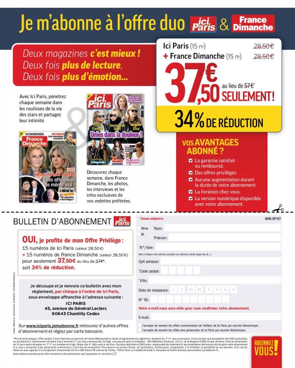 Le magazine Ici Paris vous fait partager la vie publique et privée de celles et ceux qui font l'actualité : exclusivités, interviews, enquêtes (la face cachée du showbiz, les coulisses de la télé) indiscrétions, potins.