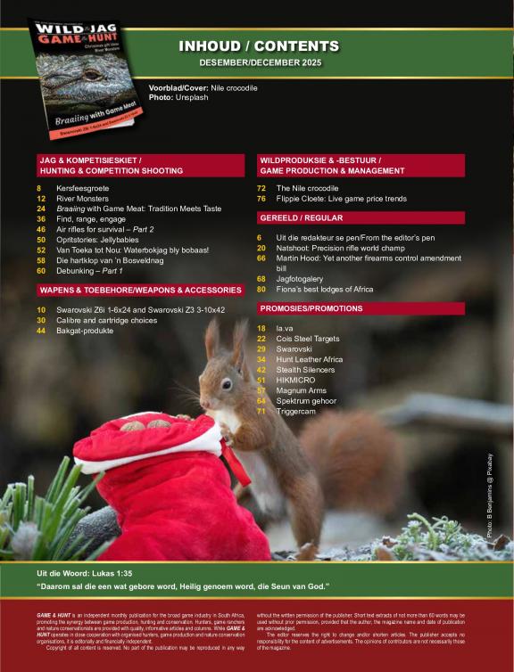 WILD & JAG/ GAME & HUNT is an independent monthly publication for the broad game industry in South Africa, promoting the synergy between game production, hunting and conservation. Hunters, game ranchers and nature conservationists are served with quality informative articles and columns. GAME & HUNT is a magazine that promotes a lifestyle to the kind of reader who does not remain just a reader but becomes a follower of the GAME & HUNT brand. While WILD & JAG/ GAME & HUNT operates in close cooperation with organised hunters, game production and nature-conservation organisations, it is editorially and financially independent. In every edition is to be found a lead article on an important aspect of the wildlife industry as well as an article on a specific animal - including small game, big game and carnivores. Also a nature article (scientific cum popular) on South Africa's plant life and/or geographical features.