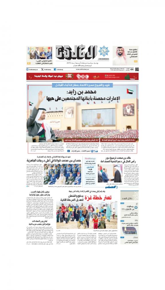 Al Khaleej (Arabic: الخليج, lit. 'The Gulf') is a daily Arabic-language broadsheet newspaper published in Sharjah, United Arab Emirates by Dar Al Khaleej. This newspaper is the first newspaper published in the country.