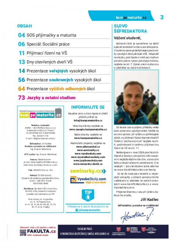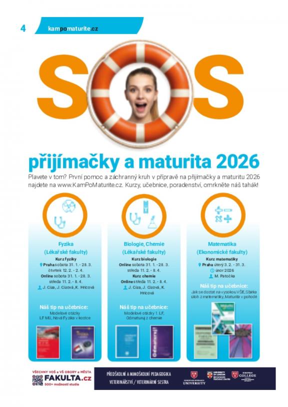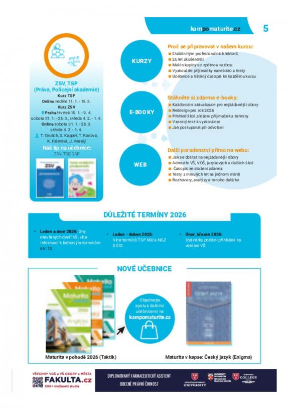Pořádáme přípravné kurzy, pomaturitní studium a nulté ročníky na přijímací zkoušky VŠ právnických, ekonomických, filozofických a lékařských fakult. Poskytujeme zdarma poradenství, prodáváme učebnice k maturitě, přijímačkám VŠ, SŠ, jazykové učebnice. Vydáváme časopis Kam po maturitě.