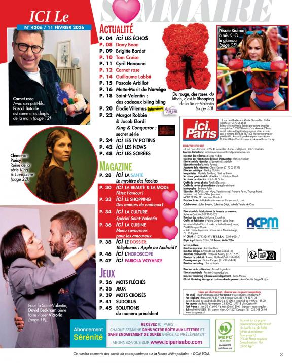Le magazine Ici Paris vous fait partager la vie publique et privée de celles et ceux qui font l'actualité : exclusivités, interviews, enquêtes (la face cachée du showbiz, les coulisses de la télé) indiscrétions, potins.