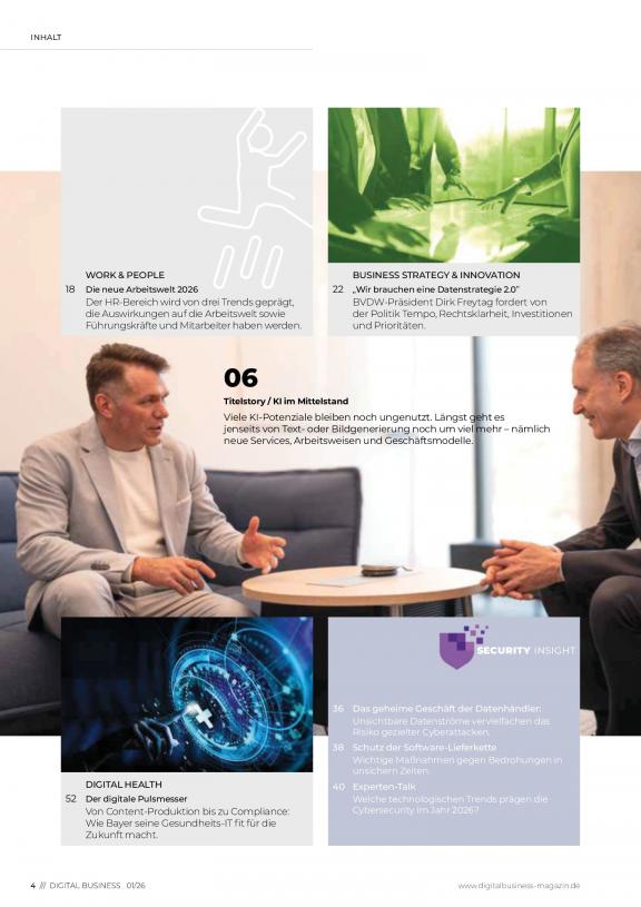 Das DIGITAL BUSINESS MAGAZIN informiert übergreifend, praxisnah und auf den unternehmerischen Alltag abgestimmt über die Auswirkungen der digitalen Transformation in Unternehmen. Digitale Transformation verstehen wir als durchgängige Vernetzung aller Wirtschaftsbereiche und als Anpassung der Akteure an die neuen Gegebenheiten der digitalen Ökonomie.