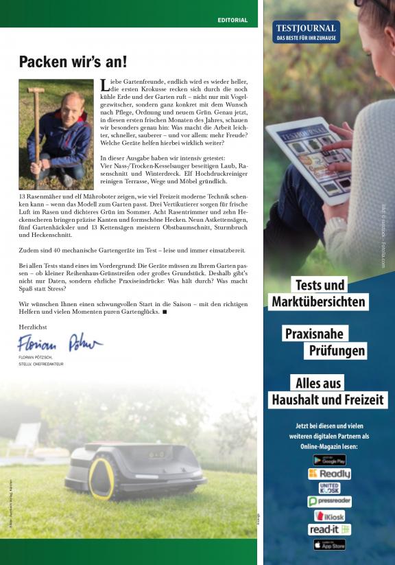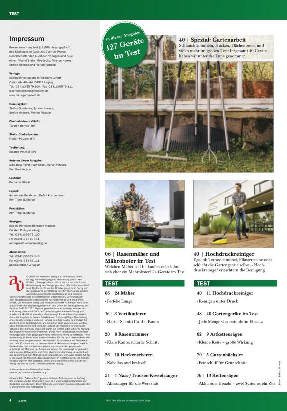 Wir haben für Sie die Geräte rund um Ihren Garten verglichen und für Sie in der Praxis im harten Alltag in Ihrer GARTENWELT getestet: Vier Hochdruckreiniger, vier Allessauger und sieben Nass-/Trocken-Kesselsauger sorgen für ein gelungenes Schmutzgefecht rund um Ihr Haus. Insgesamt 13 Rasenmäher und sieben Rasenmähroboter stehen ebenfalls zur Wahl, um den Schnitt der Grünfläche zu erledigen. Für die Rasenkanten und Ecken haben wir zehn Rasentrimmer genauer unter die Lupe genommen. Zusammen genommen zehn Laubsauger wurden zudem getestet, um auch die Reste vom letzten Herbst noch schnell beseitigen zu können. Sechs Kettensägen und in der Summe ganze elf elektrische Heckenscheren werden verglichen, um auch dem Wildwuchs im Garten professionell entgegentreten zu können. Für die gemütliche und genüssliche Zeit in Ihrem Garten haben wir schon jetzt vier Gasgrills, vier Elektrogrills und ein gemütliches Gartenhaus für Sie auf Lager.