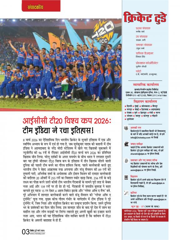 Cricket Today is a monthly cricket magazine in Hindi published by a Delhi-based company, Diamond Magazines. It is one of the most popular cricket magazines in India, and is known for its in-depth coverage of all aspects of the game, including: * Match reports and analysis: Cricket Today provides detailed match reports and analysis of all major cricket matches, including Test matches, One-Day Internationals, and T20 Internationals. The magazine also covers domestic cricket tournaments in India, such as the Ranji Trophy and the Indian Premier League. * Player profiles and interviews: Cricket Today features profiles of top cricket players from India and around the world, as well as interviews with them. These profiles and interviews provide readers with insights into the lives and careers of these players. * Expert columns and commentary: Cricket Today features columns and commentary from leading cricket experts, including former players, coaches, and journalists. These columns and commentary provide readers with different perspectives on the game. * Cricket news and trends: Cricket Today covers the latest cricket news and trends from India and around the world. The magazine also provides analysis of the latest developments in the game. Cricket Today is a valuable resource for anyone who is interested in cricket. It is a must-read for anyone who is looking to stay informed about the latest cricket news and trends, or who is looking for in-depth coverage of all aspects of the game.