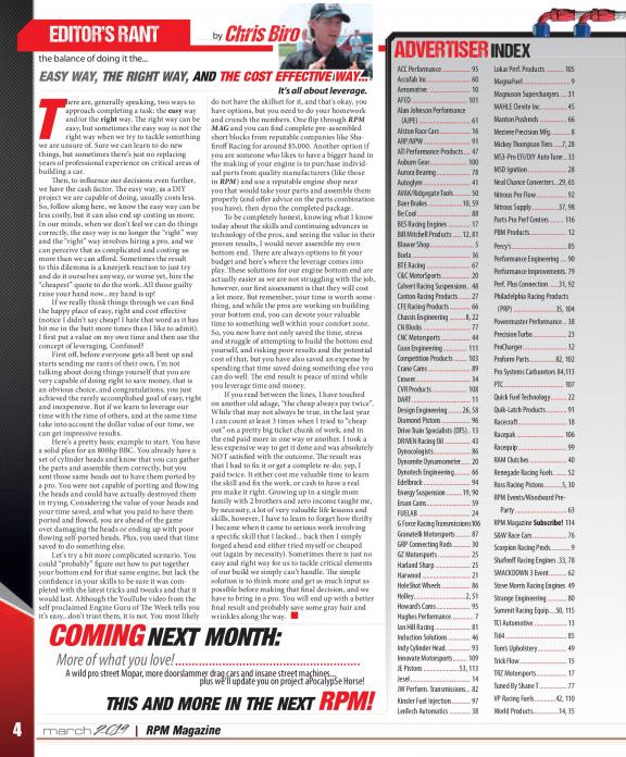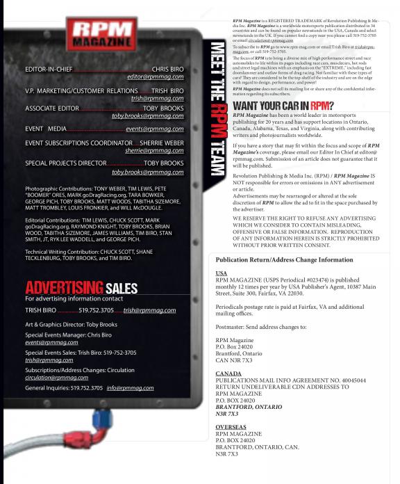The focus of RPM is to bring a diverse mix of high performance street and race automobiles to life within its pages including: Race cars, musclecars, hot rods and street legal machines with an emphasis on the "Extreme" including Fast doorslammer and outlaw forms of Drag Racing. Not familiar with these types of cars? They are considered to be the top shelf of the industry and are on the edge with regards to design and power. Grab your copy today and check it out. We are sure you will want more!