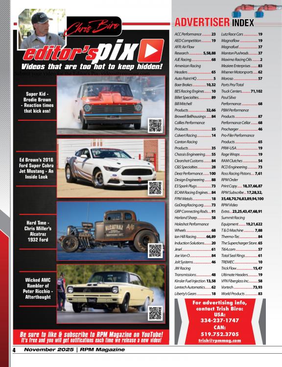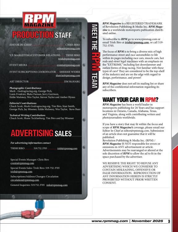 The focus of RPM is to bring a diverse mix of high performance street and race automobiles to life within its pages including: Race cars, musclecars, hot rods and street legal machines with an emphasis on the "Extreme" including Fast doorslammer and outlaw forms of Drag Racing. Not familiar with these types of cars? They are considered to be the top shelf of the industry and are on the edge with regards to design and power. Grab your copy today and check it out. We are sure you will want more!