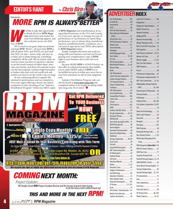 The focus of RPM is to bring a diverse mix of high performance street and race automobiles to life within its pages including: Race cars, musclecars, hot rods and street legal machines with an emphasis on the "Extreme" including Fast doorslammer and outlaw forms of Drag Racing. Not familiar with these types of cars? They are considered to be the top shelf of the industry and are on the edge with regards to design and power. Grab your copy today and check it out. We are sure you will want more!
