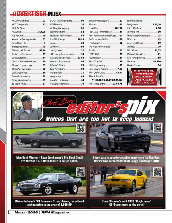 The focus of RPM is to bring a diverse mix of high performance street and race automobiles to life within its pages including: Race cars, musclecars, hot rods and street legal machines with an emphasis on the "Extreme" including Fast doorslammer and outlaw forms of Drag Racing. Not familiar with these types of cars? They are considered to be the top shelf of the industry and are on the edge with regards to design and power. Grab your copy today and check it out. We are sure you will want more!