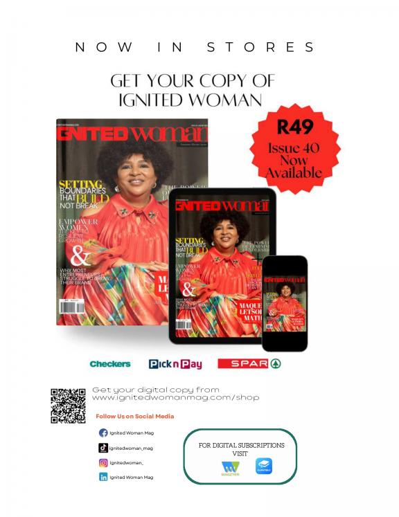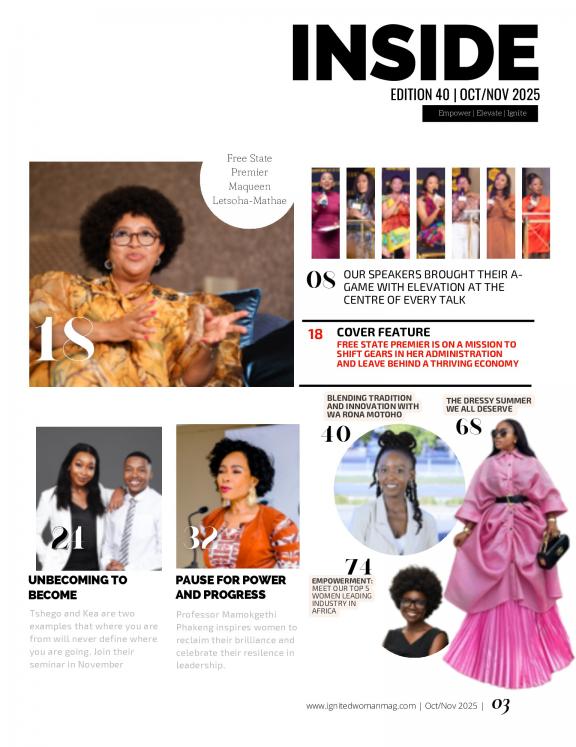 Ignited Woman Magazine is a women’s publication with a special focus on careers, entrepreneurship, finances, business development and lifestyle. We contribute to the narrative of South African women who are making boss moves in seeking economic freedom and the empower of self and their communities. Our aim is to unearth, highlight and celebrate the achievements of these game changers. The magazine was founded by Kamogelo Seekoei and is 100% black owned.