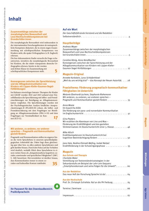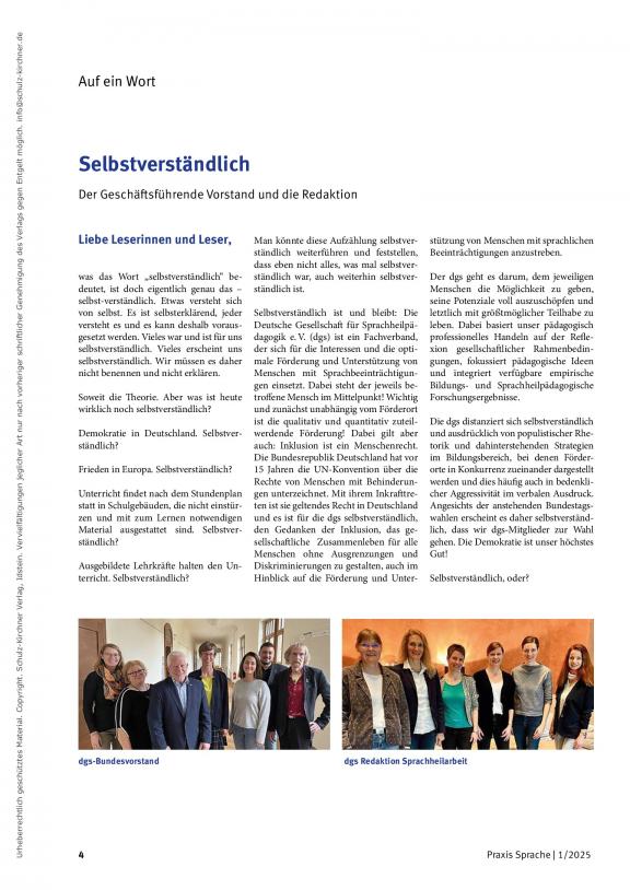 Praxis Sprache ist das offizielle Mitteilungsorgan der Deutschen Gesellschaft für Sprachheilpädagogik e. V. (dgs) und erscheint ab Januar 2013 im Schulz-Kirchner Verlag. Mit vier Ausgaben im Jahr richtet sie sich an alle im Rahmen der Sprachheilpädagogik, Sprachtherapie und Sprachförderung tätigen Personen und Berufsgruppen. Inhalte der Praxis Sprache sind Hauptbeiträge, Praxisthemen, wertvolle Zusatzmaterialien und ein Magazinteil mit Beiträgen für Unterricht und Therapie, Rezensionen und mehr. Nachrichten und Informationen aus dem Verband sowie weitere wichtige Mitteilungen werden ebenfalls publiziert. Die Hauptbeiträge durchlaufen ein peer-review-Verfahren. Eine kompetente Redaktion gewährleistet die Qualität und Aktualität der Artikel. Unterstützung erhält das Team dabei von einem wissenschaftlichen Beirat.