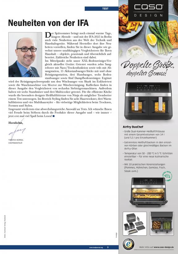 Das TESTJOURANL bereitet die wichtigsten Testberichte sowie Marktübersichten aus dem Magazin HAUS & GARTEN TEST noch einmal passend auf. Damit liefert das Testmagazin alles Wissenswerte zu aktuellen Haushaltsgeräten aus den Bereichen Wohnen, Küche, Bad und Garten sowie ebenso Nützliches rund um Genussthemen, von der Kaffeezubereitung bis hin zum Teegenuss.