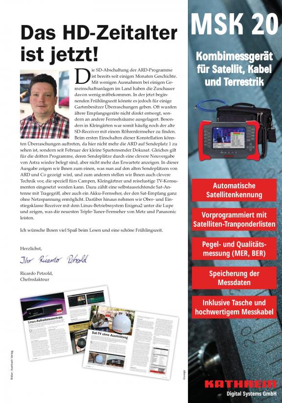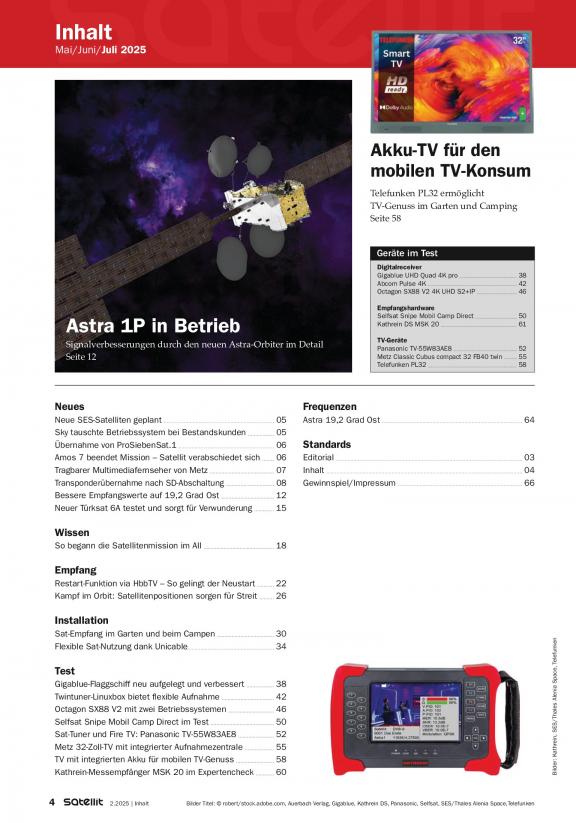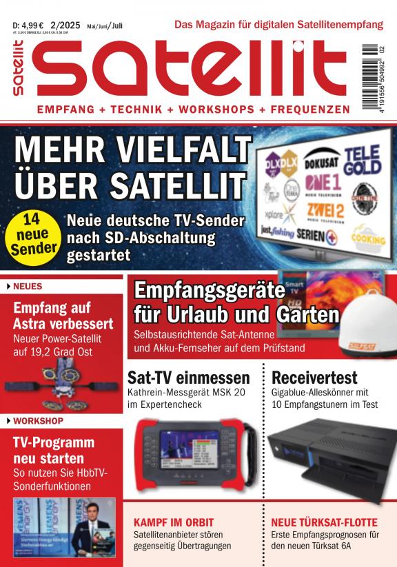 Das Heft bereitet anschaulich und leicht verständlich auf den Um- bzw. Einstieg ins digitale Zeitalter vor. Unsere Sat-Experten empfehlen die neuesten Empfangsgeräte durch die gewohnt zuverlässigen Testberichte. Der Serviceteil rundet das redaktionelle Konzept durch spannende Workshops zu Themen rund um den Receiver, die Antenne, das LNB oder das CI-Modul ab.