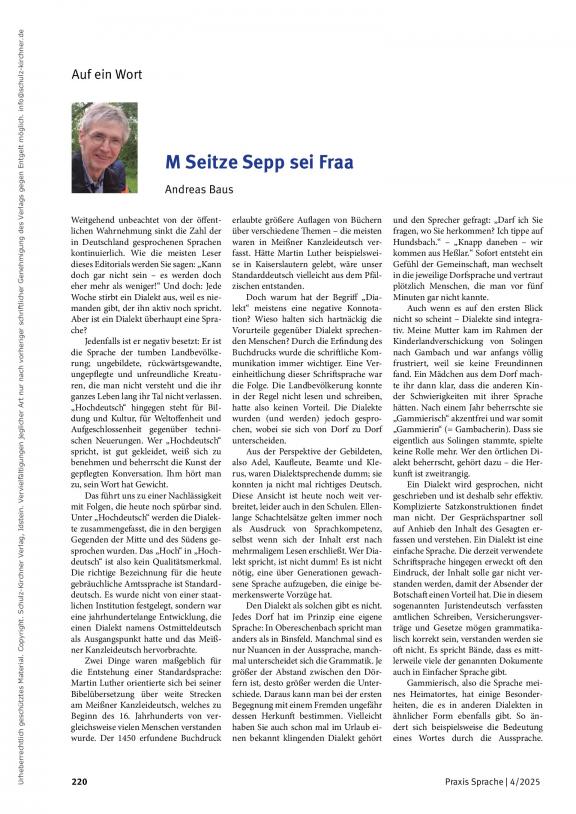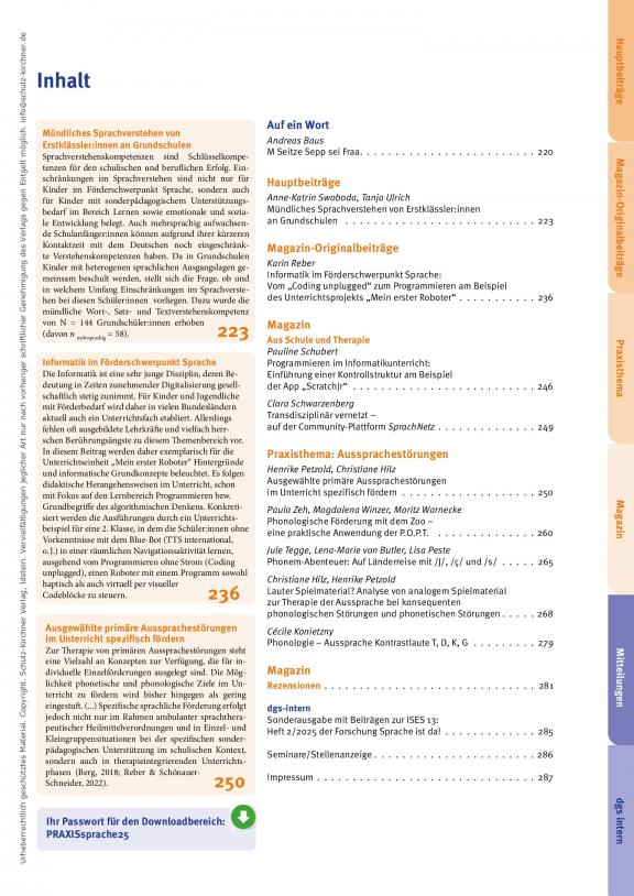 Praxis Sprache ist das offizielle Mitteilungsorgan der Deutschen Gesellschaft für Sprachheilpädagogik e. V. (dgs) und erscheint ab Januar 2013 im Schulz-Kirchner Verlag. Mit vier Ausgaben im Jahr richtet sie sich an alle im Rahmen der Sprachheilpädagogik, Sprachtherapie und Sprachförderung tätigen Personen und Berufsgruppen. Inhalte der Praxis Sprache sind Hauptbeiträge, Praxisthemen, wertvolle Zusatzmaterialien und ein Magazinteil mit Beiträgen für Unterricht und Therapie, Rezensionen und mehr. Nachrichten und Informationen aus dem Verband sowie weitere wichtige Mitteilungen werden ebenfalls publiziert. Die Hauptbeiträge durchlaufen ein peer-review-Verfahren. Eine kompetente Redaktion gewährleistet die Qualität und Aktualität der Artikel. Unterstützung erhält das Team dabei von einem wissenschaftlichen Beirat.