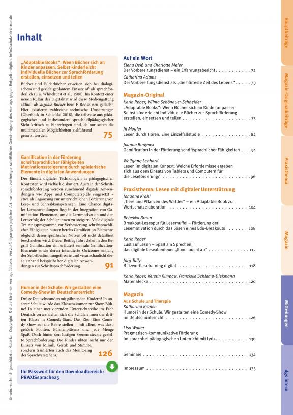 Praxis Sprache ist das offizielle Mitteilungsorgan der Deutschen Gesellschaft für Sprachheilpädagogik e. V. (dgs) und erscheint ab Januar 2013 im Schulz-Kirchner Verlag. Mit vier Ausgaben im Jahr richtet sie sich an alle im Rahmen der Sprachheilpädagogik, Sprachtherapie und Sprachförderung tätigen Personen und Berufsgruppen. Inhalte der Praxis Sprache sind Hauptbeiträge, Praxisthemen, wertvolle Zusatzmaterialien und ein Magazinteil mit Beiträgen für Unterricht und Therapie, Rezensionen und mehr. Nachrichten und Informationen aus dem Verband sowie weitere wichtige Mitteilungen werden ebenfalls publiziert. Die Hauptbeiträge durchlaufen ein peer-review-Verfahren. Eine kompetente Redaktion gewährleistet die Qualität und Aktualität der Artikel. Unterstützung erhält das Team dabei von einem wissenschaftlichen Beirat.