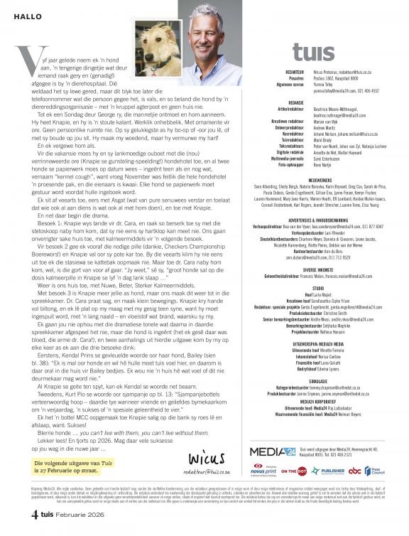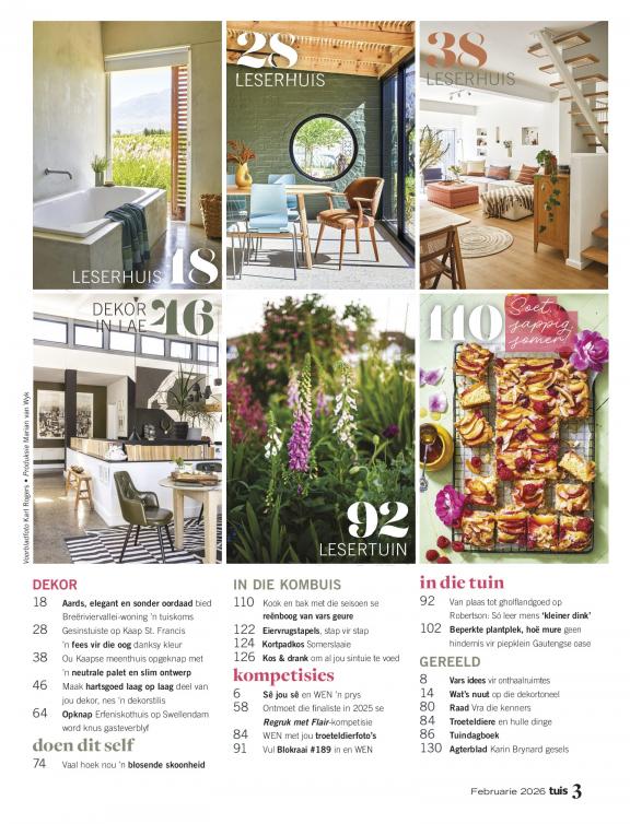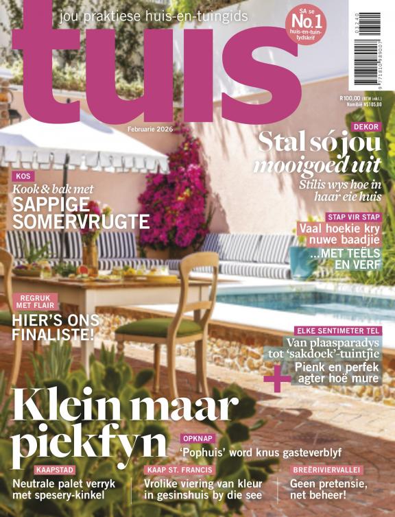 Tuis is ’n praktiese, inspirerende gids vir die huis en tuin wat lesers in staat stel om hulle blyplekke mooi te maak, en die waarde daarvan te laat toeneem – binne én buite. Die tydskrif maak die lewe makliker vir mense wat ’n huis wil koop, bou of opknap, of lus is vir tuinmaak, kosmaak of mooimaak. Tuis wys nie net mooi goed nie – ons verduidelik ook wat waarde sal toevoeg tot jou eiendom, en hoekom. Die tydskrif bied bekostigbare en toeganklike keuses aan lesers, hulp met selfdoenprojekte, en raad vir opknapwerk. Dis vir gewone mense – mans én vroue – met gewone lewens, gewone loopbane en gewone huise; mense wat graag hulle eiendomme wil verbeter, en dit moet doen op ’n begroting.