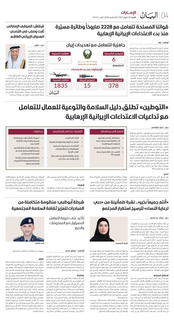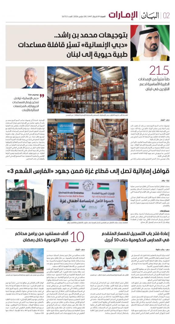 يمكنك الآن الاستمتاع بتصفح النسخة الرقمية، والتي هي طبق الأصل عن النسخة الورقية لصحيفة البيان على هاتفكم الذكي أو الجهاز اللوحي أو على شاشة الحاسوب. النسخة الرقمية تتيح لكم تجربة متميزة للعدد اليومي بكل المقالات والأخبار والميزات وبطريقة سلسة حيث يمكنكم التمتع بقراءة صفحاتكم المفضلة مع إمكانية البحث ومشاركة الأخبار في أي وقت وأي مكان كمرادف عن النسخة الورقية. بالإضافة لميزة القراءة بدون إنترنت عند تحميل النسخة المطلوبة وميزات أخرى ستتعرفون عليها عند تحميل التطبيق. في العاشر من مايو سنة 1980 صدر العدد الأول من صحيفة "البيان" لكي تشكل خلال رحلة مستمرة خلال العقود الأربعة مدرسة صحافية خرجت أجيالا من الصحافيين على مستوى دولة الإمارات والعالم العربي. وتصدر الصحيفة، التي تتبع مؤسسة دبي للإعلام، يومياً في نسخ ورقية ورقمية، تصل الى جمهور عريض من المتابعين في دولة الإمارات وعلى امتداد العالم العربي والعالم.