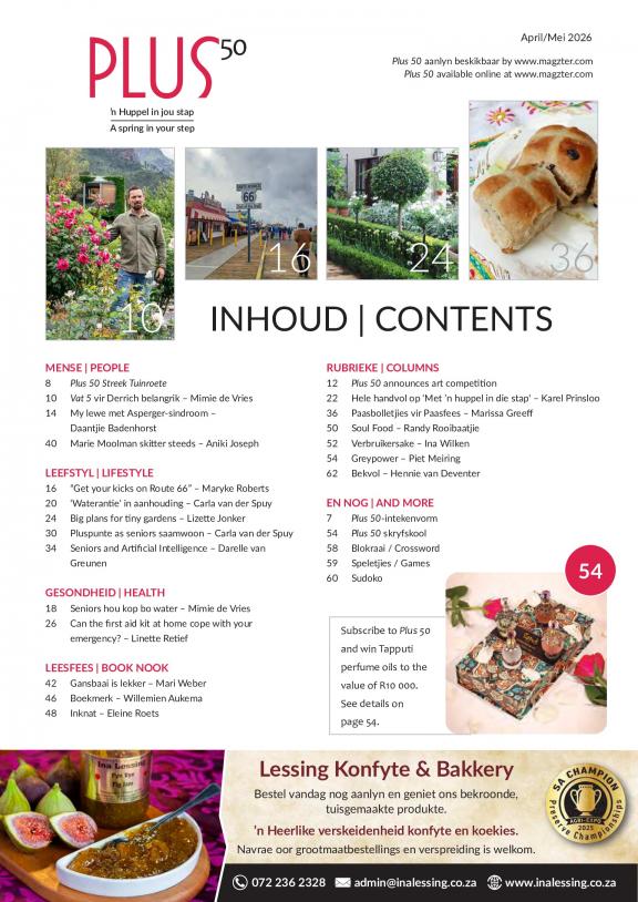 Plus 50 is ‘n nasionale tydskrif gerig op die seniorsmark van Suid-Afrika. Dit is die mondstuk van die seniorsorganisasie GrysKrag, hoewel dit deur ‘n onafhanklike kommersiële instansie Plus 50 Media (Edms) Bpk uitgegee word. Die tydskrif het in 2005 vir die eerste keer verskyn. Die hartslag van die tydskrif is positiewe veroudering. Die artikels is in Afrikaans of in Engels en raak onderwerpe oor ‘n wye spektrum van seniorsbelangstelling aan, waaronder aftree-beplanning, behuising, pensioen- en geldsake, emosionele en liggaamlike gesondheid, inspirerende persoonlikhede, sport, kultuur, vakansies, stokperdjies, nuwe boeke, jonkbly-modes en verjongende kure. Die tydskrif verskyn elke twee maande: Januarie/Februarie, Maart/April, Mei/Junie, Julie/Augustus, September/Oktober, November/Desember. Dit het ‘n oplaag van 13 000, dra artikels in Engels en Afrikaans, is nie-polities van aard, word landwyd versprei en is to koop by supermarkte (Spar, Pick’nPay), boekwinkels (Exclusive Books, CNA, PNA), sowel as by sommige vulstasies en apteke. Die redakteur van die tydskrif is dr Karel Prinsloo en die mediese redakteur is professor Oppel Greeff, hoof van die Departement Farmakologie aan die Universiteit van Pretoria. Plus 50 is a national magazine aimed at the seniors market of South Africa. It is the mouthpiece of the seniors organisation GreyPower, although published by an independent commercial company Plus 50 Media (Pty) Ltd. The magazine appeared for the first time in 2005. A philosophy of positive ageing is at the heart of the magazine. The articles are in Afrikaans or in English and touch on a wide range of subjects of interest to seniors, such as retirement planning, housing, pension and money matters, emotional and physical health, inspiring personalities, sport, culture, hobbies, new books, looking youthfully plus 50 and anti-ageing therapies. The magazine appears every two months, i e January/February, March/April, May/June, July/August, September/October, November/December, with a print-run of 13 000. It is distributed nationally and appears on the shelves of supermarkets (Spar, Pick’nPay), bookshops (Exclusive Books, CNA, PNA) and is also on sale at selected garages and pharmacies. It is an unbiased publication not affiliated to any political party or organisation. The editor is Dr Karel Prinsloo and its medical editor is Professor Oppel Greeff, Head of the Department of Pharmacology at the University of Pretoria.