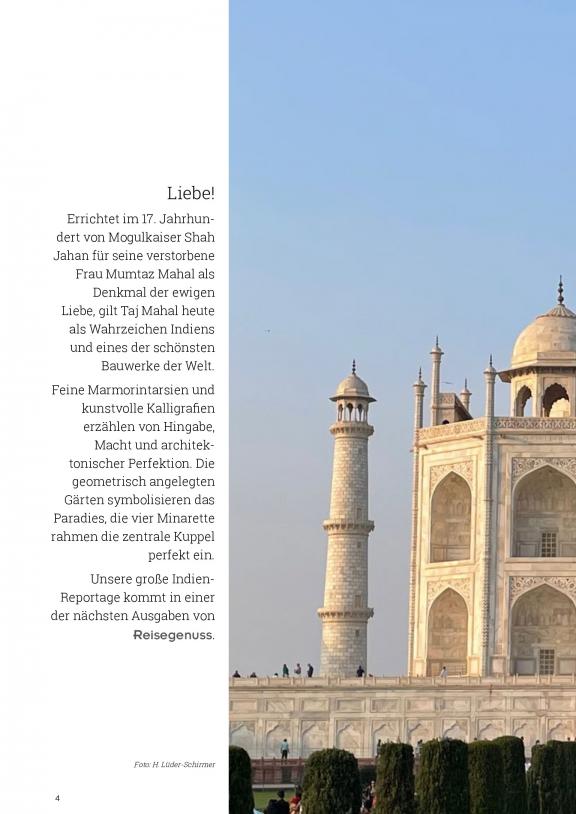 Reisegenuss ist das Premium-Reisemagazin, das in hochwertigen und umfassenden Reportagen die schönsten und interessantesten Reiseziele der Welt vorstellt.