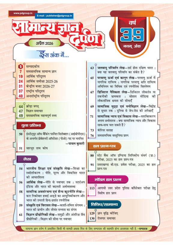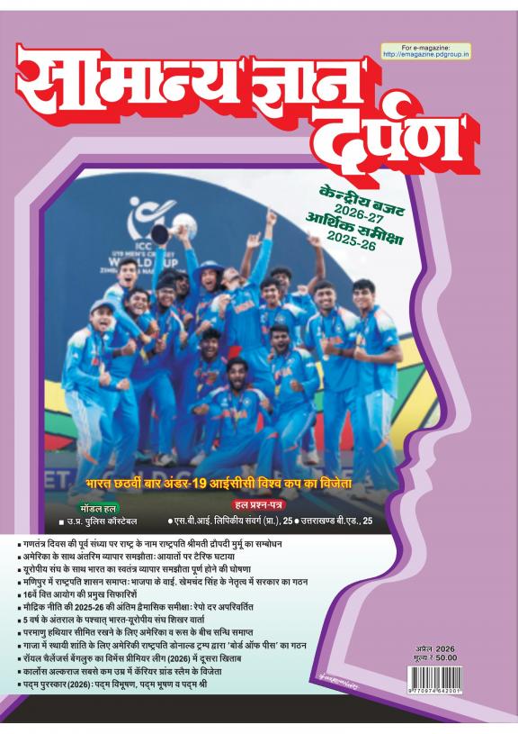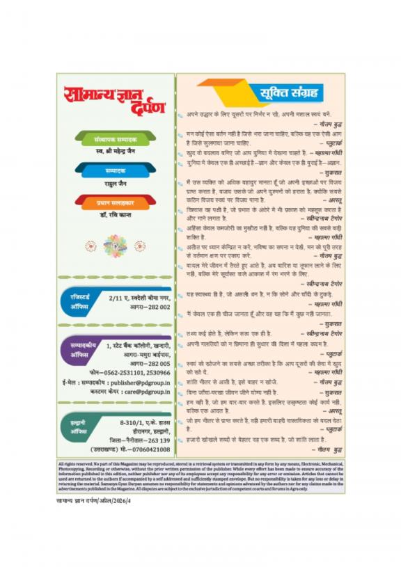 Samanya Gyan Darpan is a Hindi magazine that provides information on general knowledge, history, geography, science, and other topics. The magazine was first published in 1980 and is still one of the most popular general knowledge magazines in India. Samanya Gyan Darpan features a variety of articles each month, including: * General knowledge questions: This section asks general knowledge questions on a variety of topics. * Subject-based articles: This section publishes informative articles on a particular subject. * Special issues: This section publishes special issues on a particular topic, such as history, geography, science, or others. Samanya Gyan Darpan is a valuable resource for students, competitive exam aspirants, and the educated public in general. The magazine can help you learn about the world and increase your knowledge.